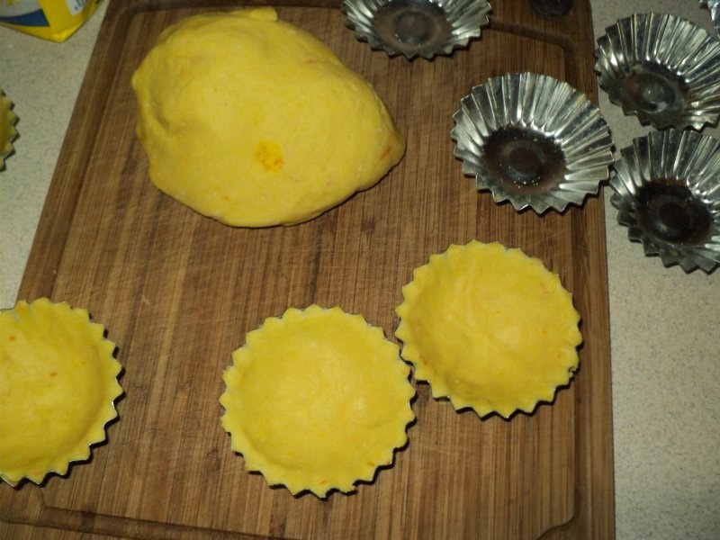 Z mąki, żółtek, margaryny, cukru, wanilii, skórki z pomarańczy, zagniatamy ciasto i wkładamy do lodówki na 1h.